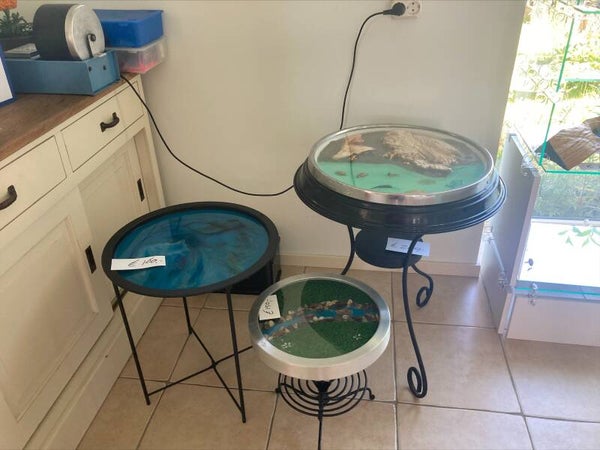 rivier met kanovaarders en grasveld. Er zit een glasplaat op.