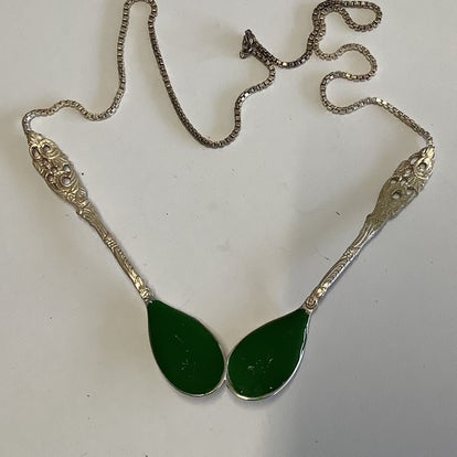 Een hanger van 2 kleinere lepeltjes gevuld met groene epoxy