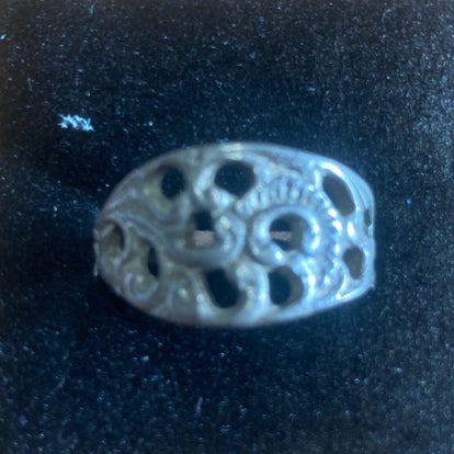 Robuuste zilveren donkere ring van het uiteinde van ee lepeltje met de letter R